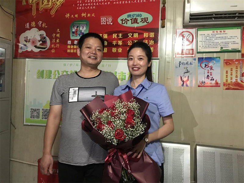 5月20日上午,918線調(diào)度室出現(xiàn)了浪漫溫馨的一幕:一位身著便裝的駕駛員師傅謝芳華手捧大束鮮花遞給了918調(diào)度員劉美花,“老婆,辛苦了”。